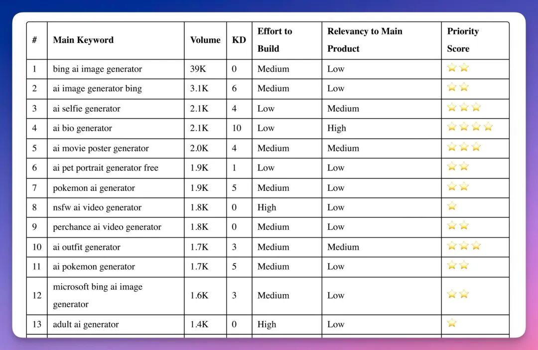然后排序规则就很清楚了:优先做那些搜索量大、难度低、容易开发、高度相关的工具。