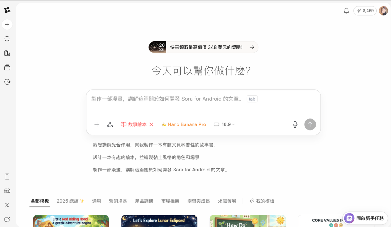 优点:积分多,每日刷新;有故事绘本,直接生成;对标Manus;