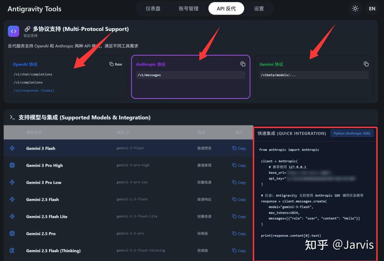 因为 Antigravity 里面包含了两个主要类别的模型,所以可以和 Gemini 和 Anthropic 模型一一对应。