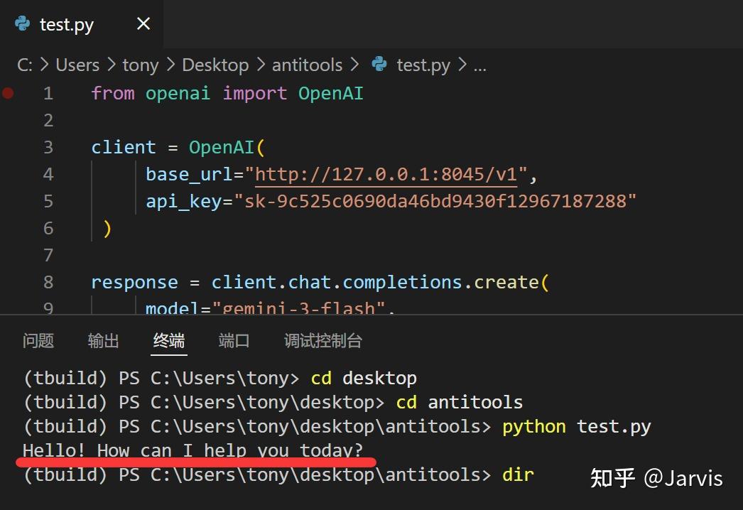 运行代码之后,只要有类似“Hello! How can I help you today ?” 就证明成功了 。