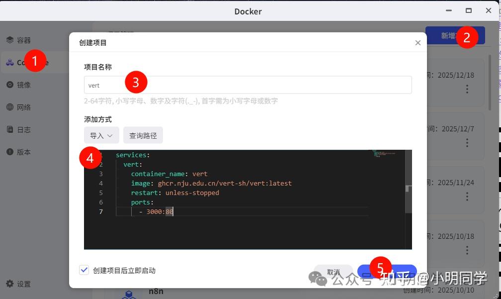 1.打开Docker应用,选择Compose,点击新增项目,项目名字vert,将下面的内容复制进黑框内,点击创建。