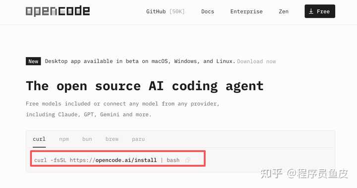 直接进入 OpenCode 官网,复制一行命令: