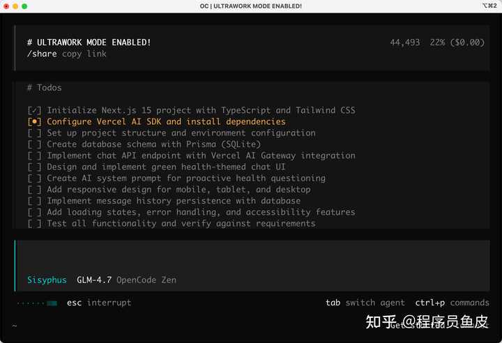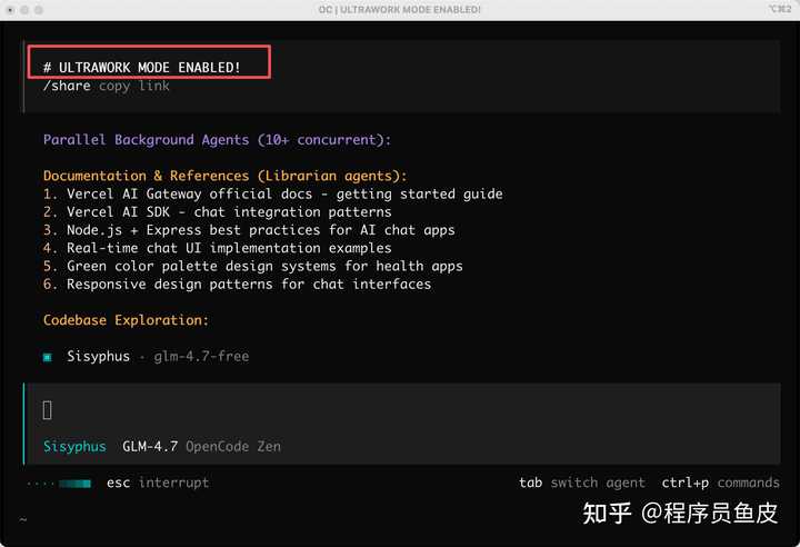 安装完成后,再次进入 OpenCode,之后只需要在你的提示词里加上 ultrawork(或 ulw)这个开挂咒语,就能激活全部增强功能。自动调度多个 AI 模型同时工作、深度探索代码库、锲而不舍地执行。