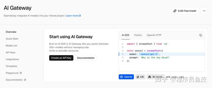 而且 Vercel AI Gateway 支持对接 500 多个大模型,还有免费额度,非常适合学习和小项目。