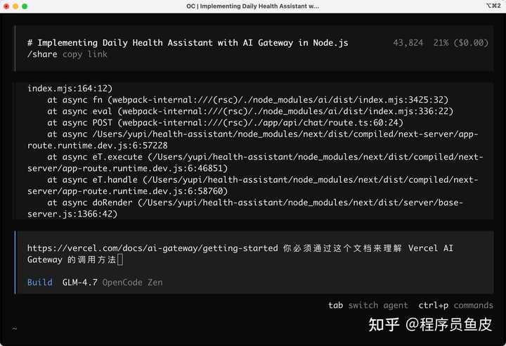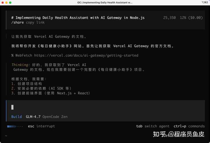 点击发送后,OpenCode 会自动使用网页抓取工具读取 Vercel AI Gateway 的官方文档,学习最新的用法: