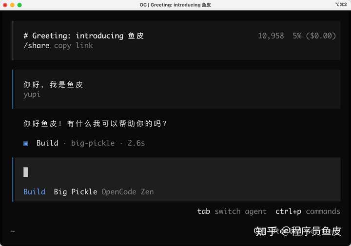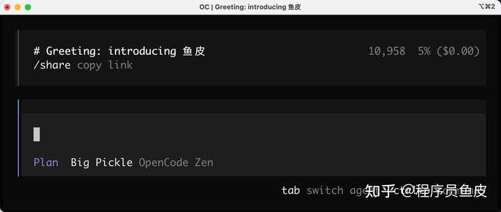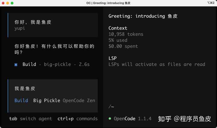 安装完成之后,输入 opencode 进入程序,接下来你就可以愉快地使用了~