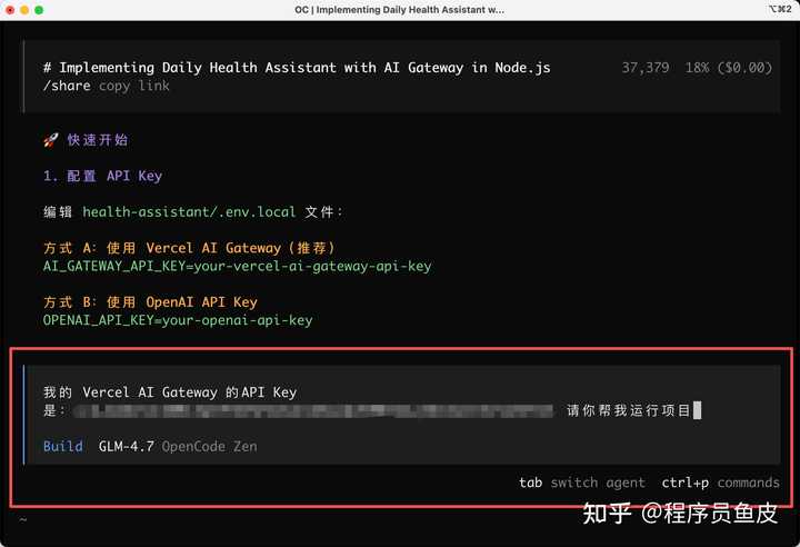 3)我直接把之前拿到的 Vercel 的 API Key 提供给 AI,让它帮我启动项目: