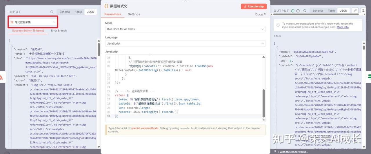 我们通过Code节点来整理数据格式,将数据格式调整为匹配多维表格写入的格式
