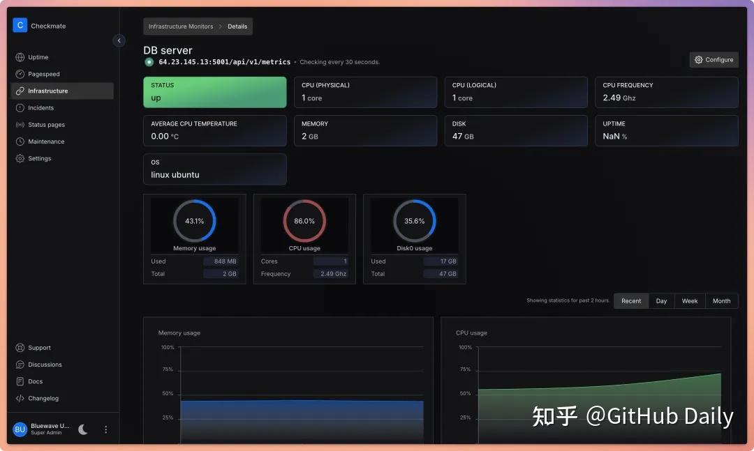 功能层面,Checkmate 做得确实很强大。它不仅能看网站有没有挂,还能深入监控每台服务器的运行状况。