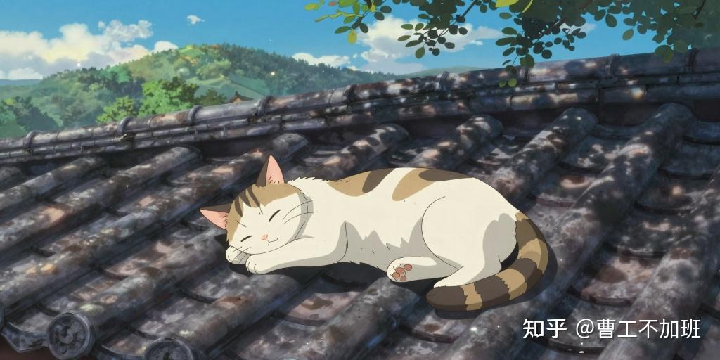 Prompt: 宫崎骏风格,一只慵懒的三花猫趴在老旧的瓦片屋顶上晒太阳,背景是清新的蓝天白云和远处的青山,画面充满治愈感。