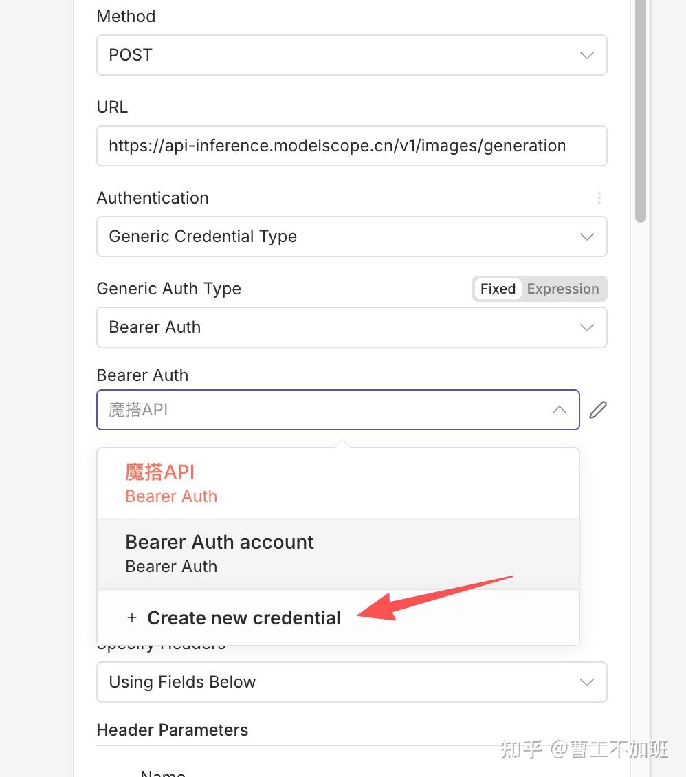 拿到 Key 之后,回到 n8n。导入我提供的工作流文件,在 “发起生成任务” 这个节点里,创建一个凭证。