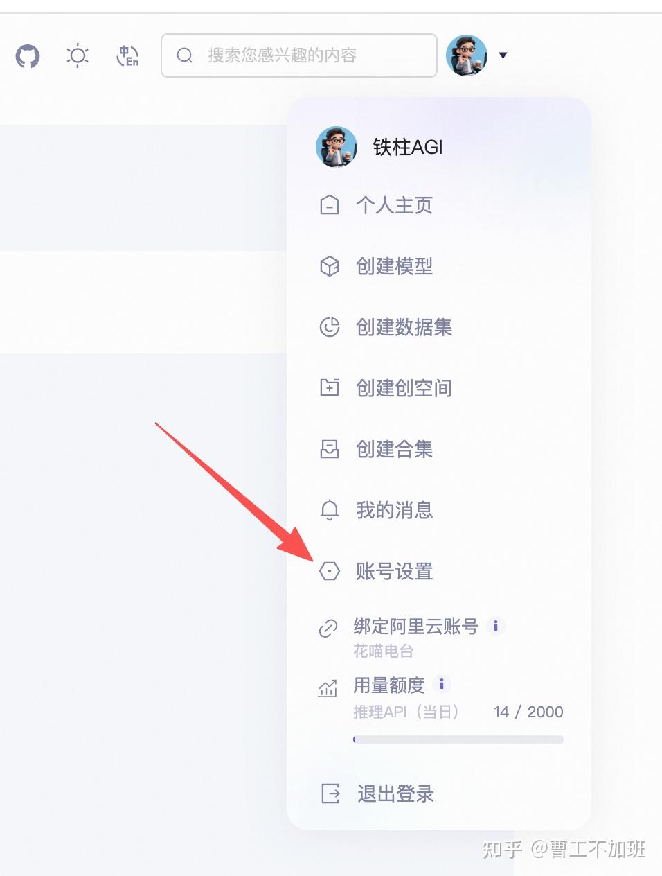先去魔搭社区(https://modelscope.cn)注册个账号,登录进去。右上角点击头像,找到 “账号设置”。