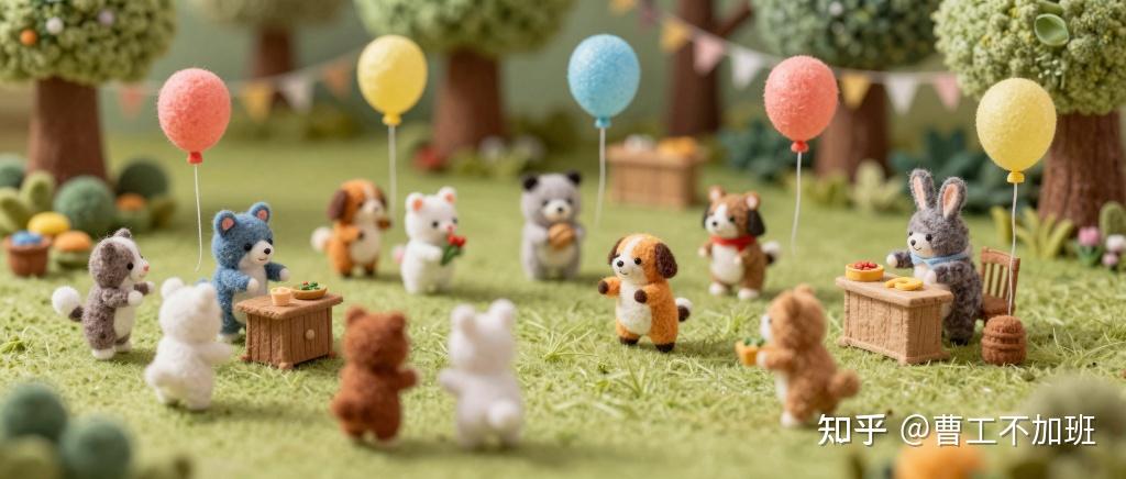 Prompt: 微缩场景,移轴镜头,一群可爱的毛毡小动物在森林里举办庆典,天上飘着彩色气球,2.5D视角,细节丰富,童话氛围。