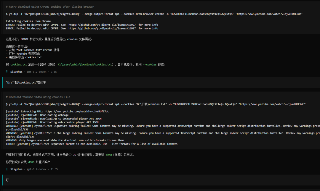 第一次运行,其实会遇到很多问题,比如说Youtube防爬机制很强,需要你装个浏览器扩展导出Cookie,比如要安装一些其他的项目等等,不过这些AI都会指导你干好。