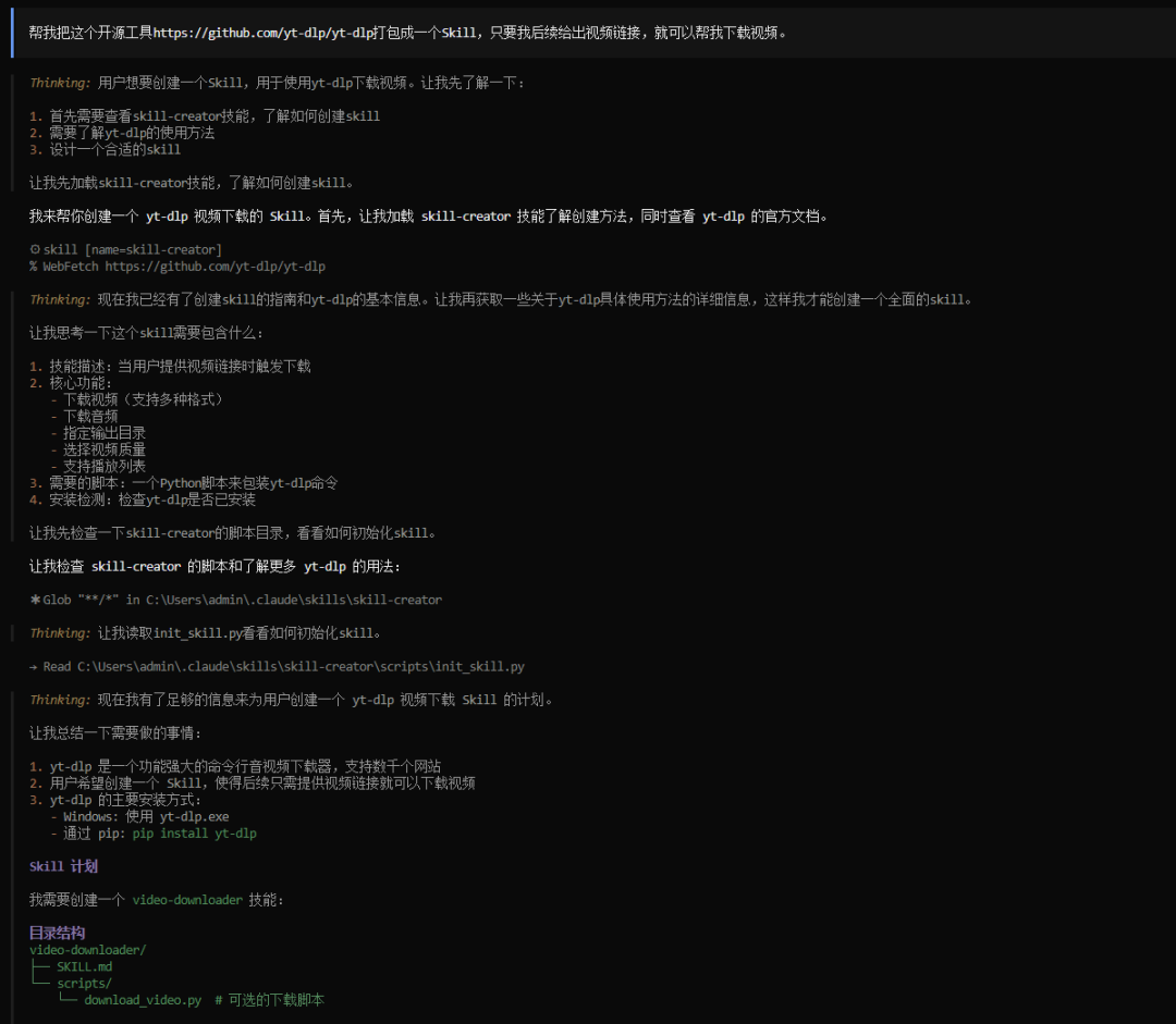 然后,Agent就会开始调用skill-creator这个生成器,开始分析yt-dlp这个项目,然后开始规划要怎么打包封装成一个Skill。