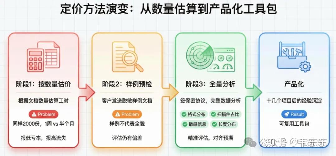 拿到报告之后,我一般会先做个总体评估:扫描型 PDF 占多少、表格密集的文档有多少、P90 的文档长度大概在什么水平。这些数据心里有数之后,就能大致判断项目的复杂度。如果复杂度不高,简单沟通一下范围和周期就能报价。如果通过报告发现文档数量大、复杂度高的占比也不低,我一般会建议先做付费 POC。一方面是为了筛选认真的客户,另一方面也是因为 POC 本身有成本,比如扫描件多的话 OCR 要调外部 API,这些都需要提前讲清楚。