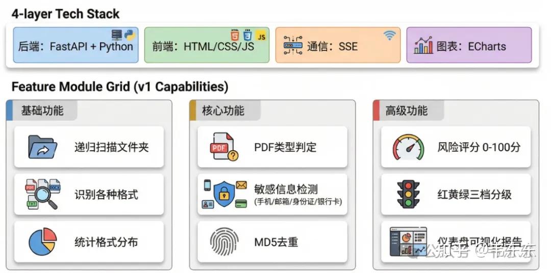 第一版做了挺多功能。递归扫描文件夹、识别各种格式、统计格式分布,这些是基础。PDF 会自动判断是文字型还是扫描型。敏感信息检测支持手机号、邮箱、身份证、银行卡。重复文件用 MD5 去重。还做了一个风险评分,0-100 分,红黄绿三档分级。前端是仪表盘风格的可视化报告,看起来挺像那么回事。