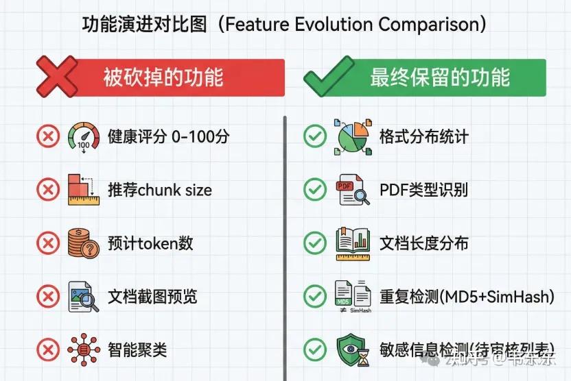 准确的功能应该保留。格式分布统计、PDF 文字型/扫描型分流、文档长度分布、MD5 重复检测——这些都是客观的、可验证的,输出就是输出,没有歧义。