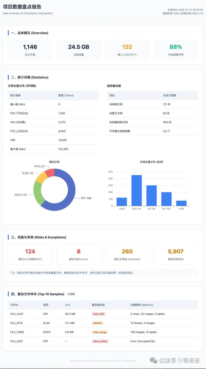 后来我改成让客户先发一些脱敏后的样例文档过来,跑一遍预检再报价。但这个做法也有些问题。大部分客户挑选的样例往往不能代表全貌,要么挑的太简单,要么挑的太复杂,总之讲不清楚实际情况。基于样例做报价和 POC,还是会有偏差。再后来和一些信任关系比较好的线下客户合作,签完保密协议之后能直接接触到全量文档。拿到全量数据之后,我会先做一遍整体的文档分布分析和入库前的质量检查,看看格式分布、扫描件占比、敏感信息、文档长度分布这些。这样才能给出靠谱的工作量评估,把握一期需求边界、哪些二期处理、和老板对齐预期。