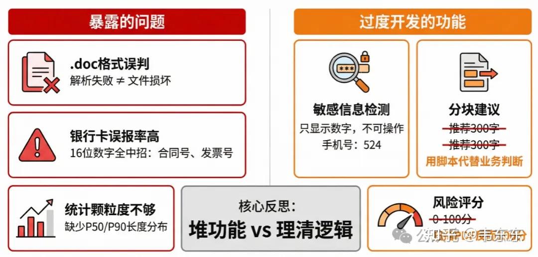 不准确的功能需要改进。敏感信息检测的问题不是不能做,而是不能只给一个统计数字,得展示具体在哪个文件、哪个位置、前后文是什么,让人能判断是不是误报。风险评分的问题是用评分来划分风险,逻辑不如规则分类清晰,不如直接按”扫描件”、”解析失败”、”含敏感信息”这些规则来分类。