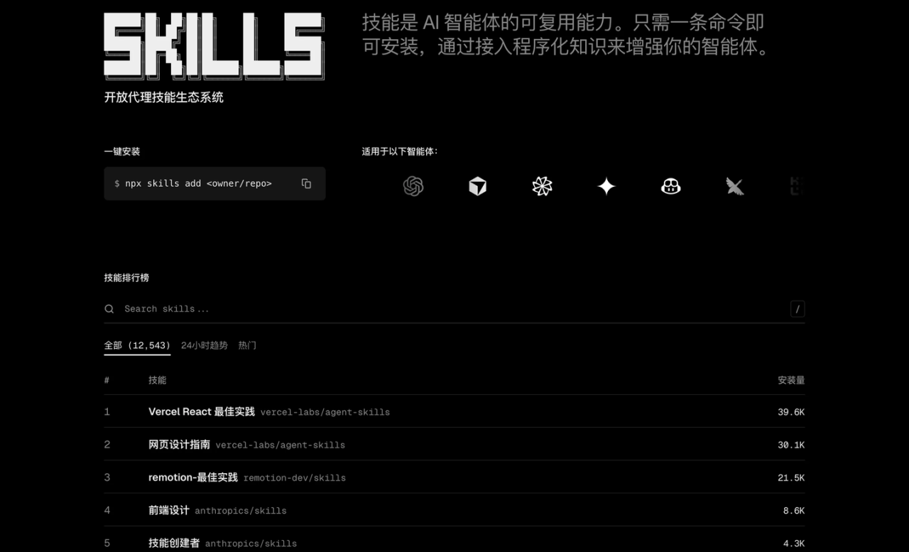 刚好,最近 Vercel 上线了一个 Skills 商店。