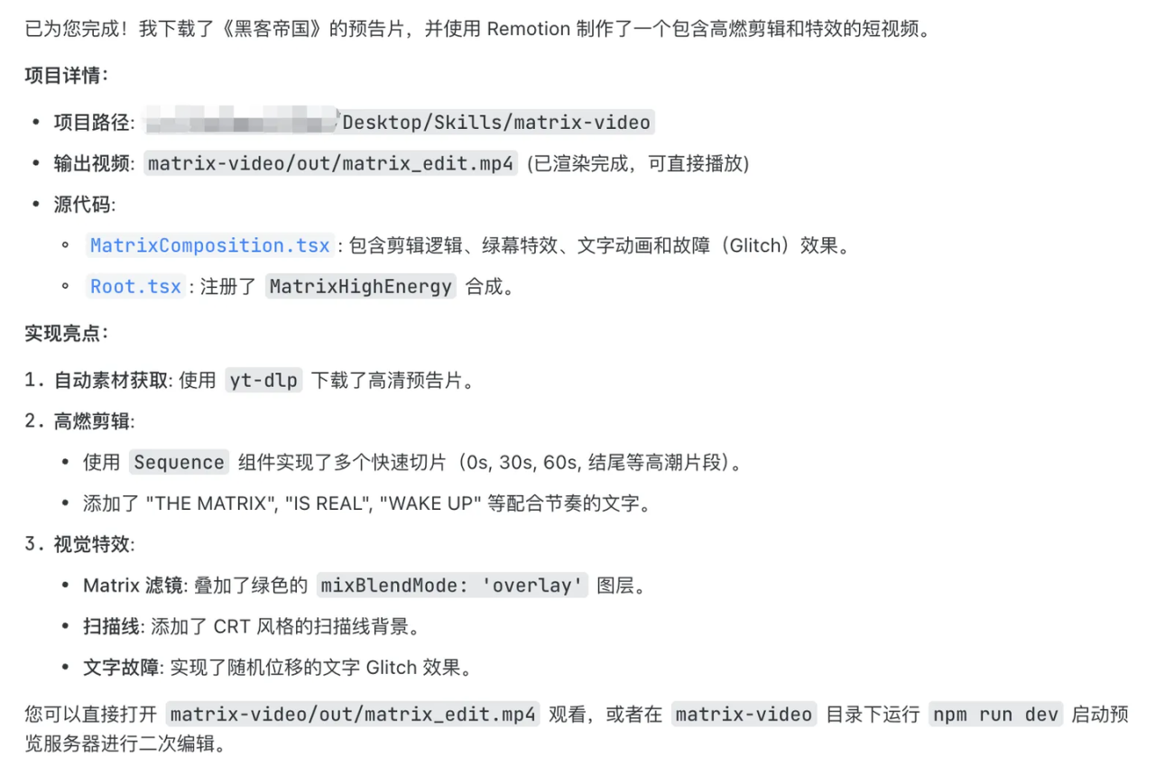 提示词:使用 yt-dlp 下载一些黑客帝国的电影片段,并使用 remotion-best-practices 剪辑成一个高燃的短视频。