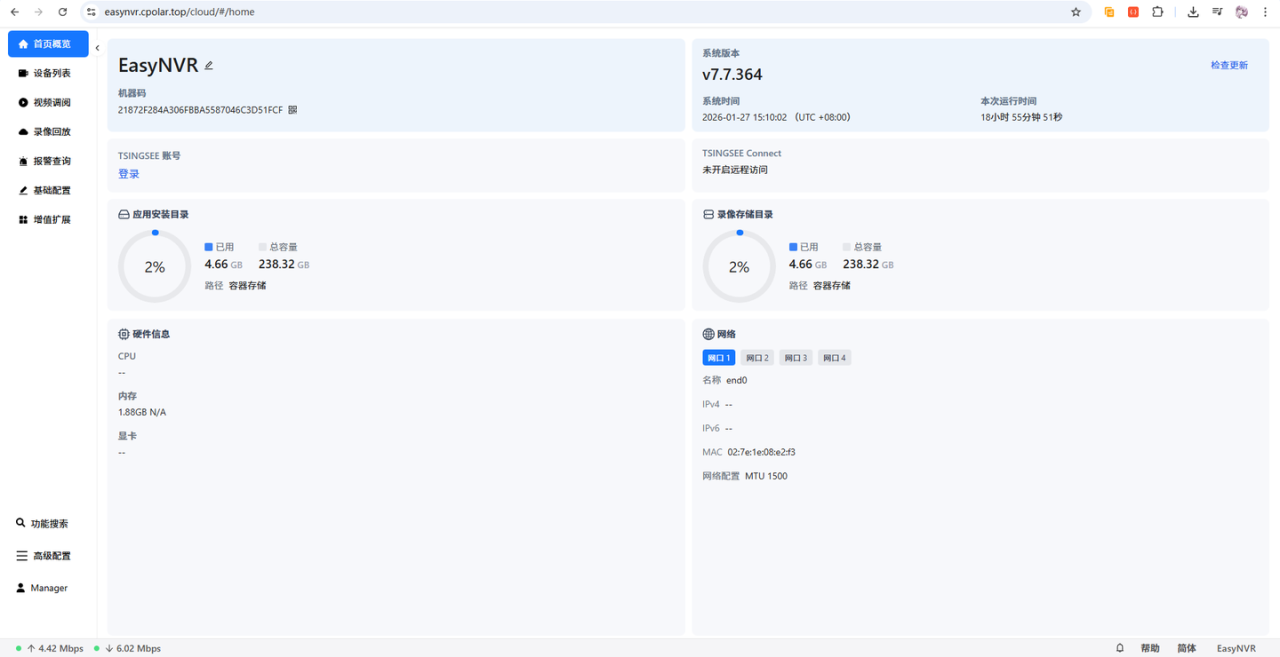 不过,重头戏还在后头! 光能看直播怎么够?我们的终极目标是把 N1 变成一台强大的 NVR 录像机,实现 24小时自动录制、回放,把视频牢牢存在自己的硬盘里,彻底省下每月的云存储费!接下来,我们就用 EasyNVR 来接管这条 RTSP 流,完成这最后 1% 的拼图!