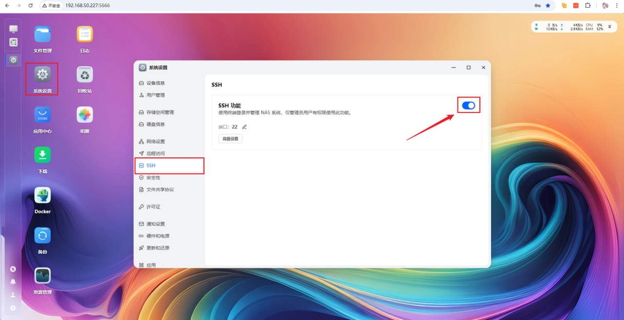 首先,确保你的Nas系统,开启了SSH服务,以飞牛Nas为例,首页点击系统设置>SSH>启动SSH服务:
