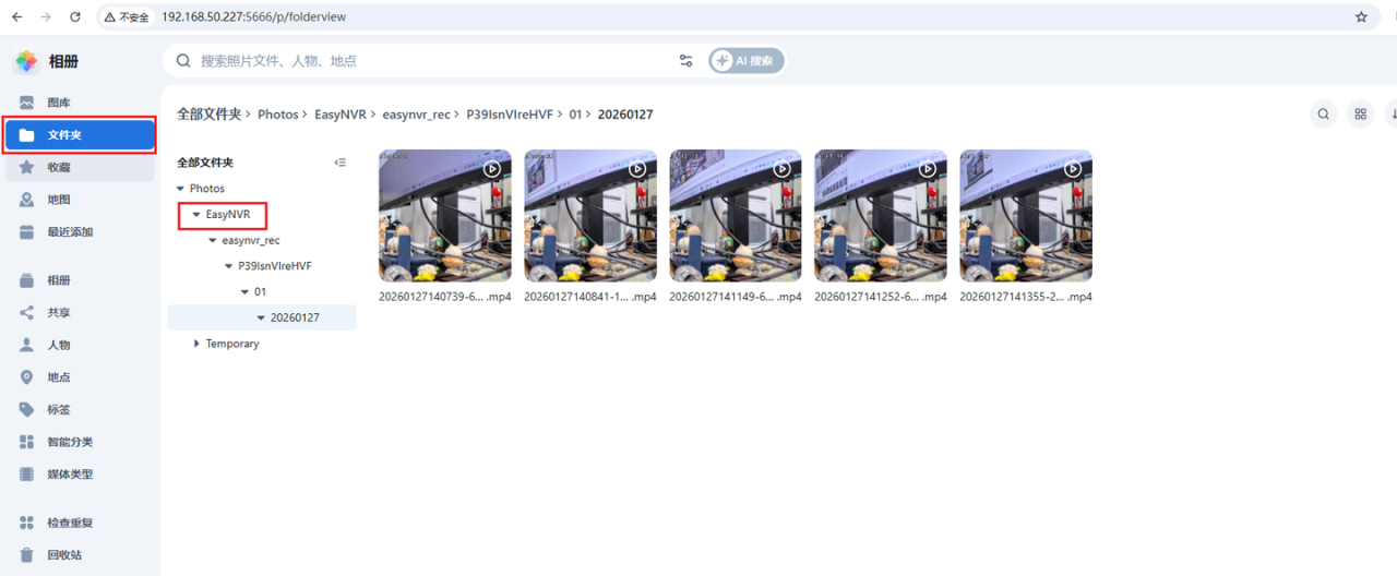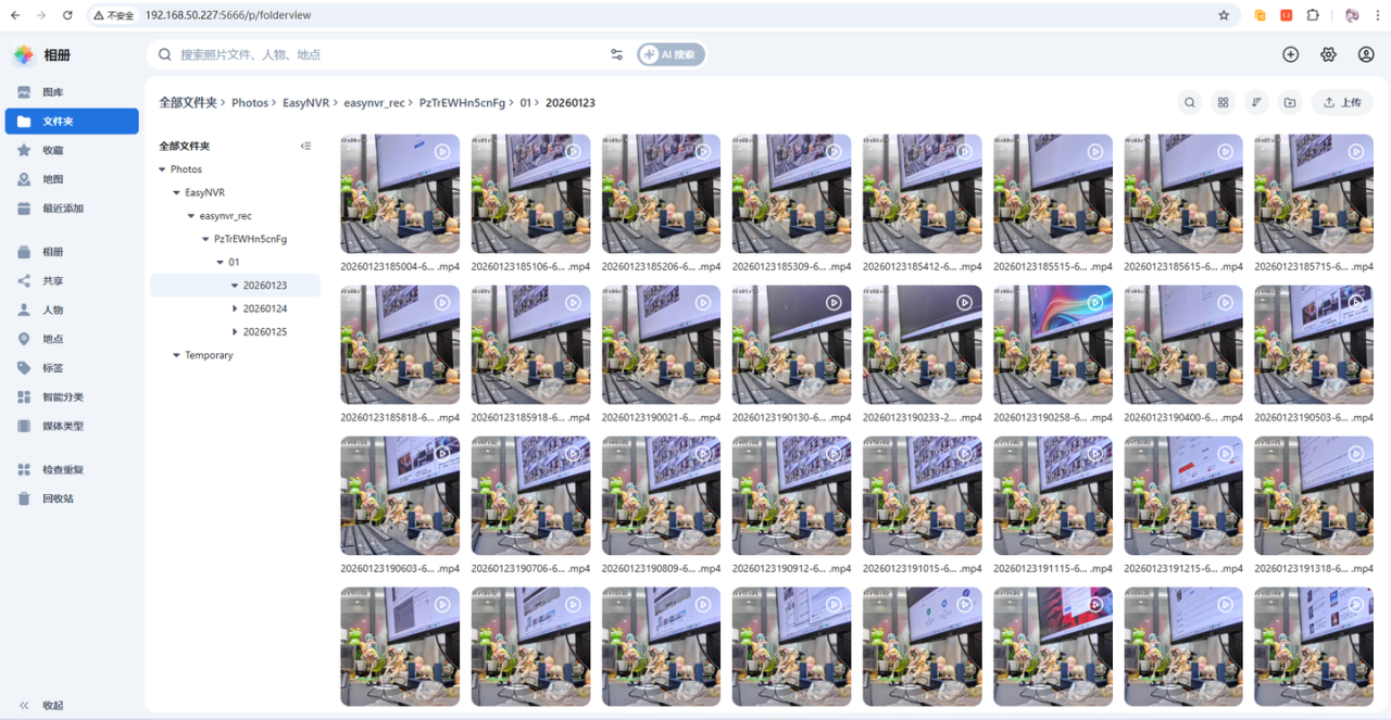 可以看到,录制的视频,都在飞牛相册中显示了,录制的视频,全部显示在Photos/EasyNVR路径下!这样,EasyNVR 录制的视频能够直接出现在飞牛相册中统一管理和查看了。