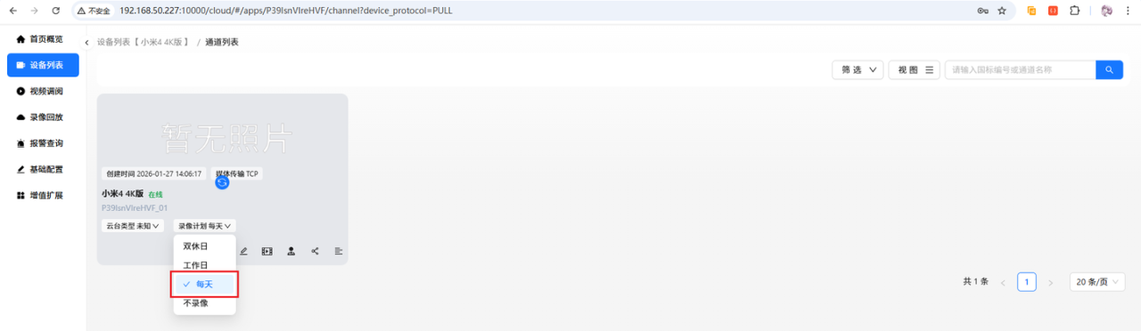 点击通道列表图表,点击进入,然后可以看到录像计划显示为未录像,这里直接将其设置为每天,这样就会一直录制啦: