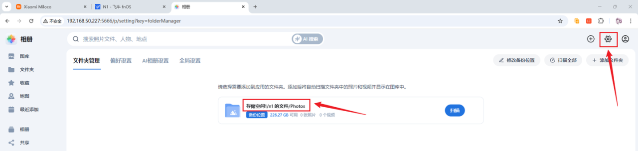 首先,我们点击飞牛相册的设置图标,进入设置页面,可以看到路径显示为存储空间1/n1 的文件/Photos这样的中文地址::