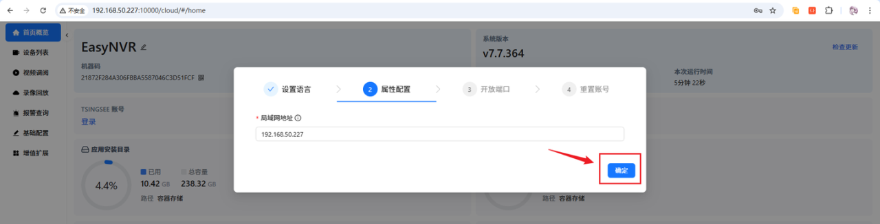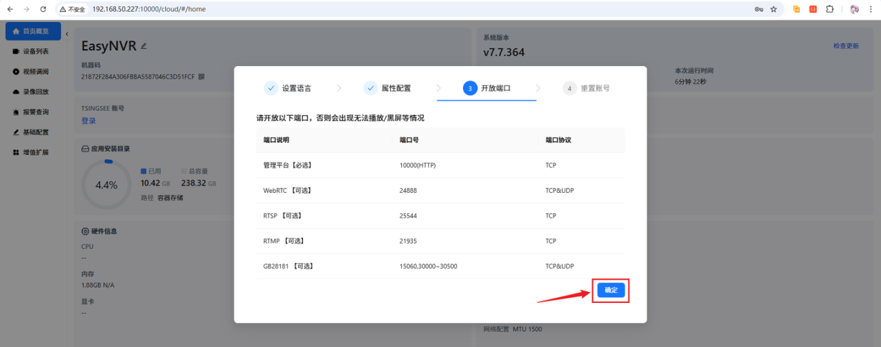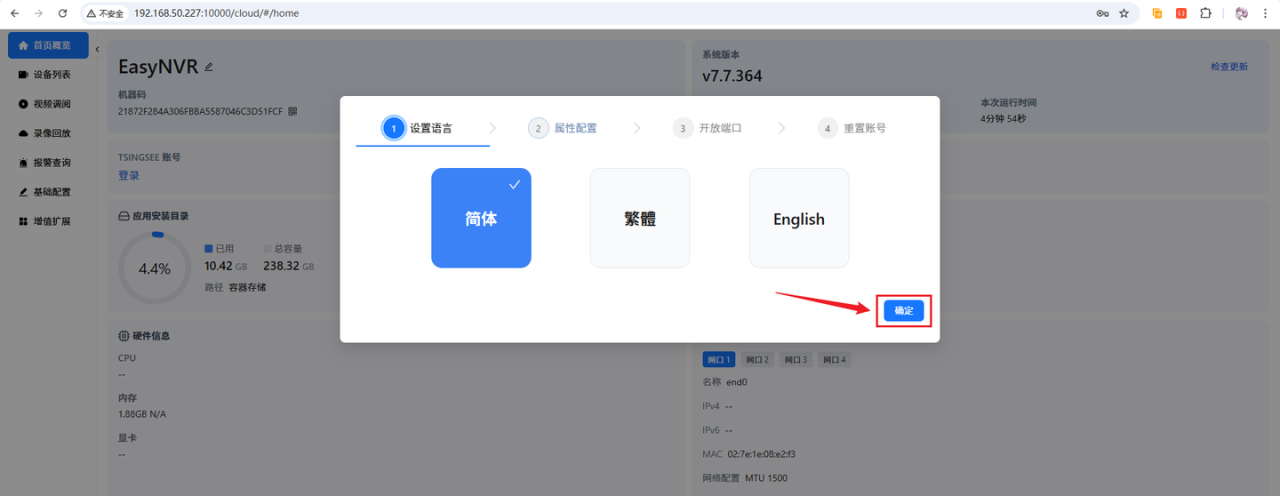 这样就成功访问到了easynvr的登录界面啦,首次直接点击登录按钮即可登录进主页,成功进入EasyNVR的首页后,这里选择简体语言,然后下一步: