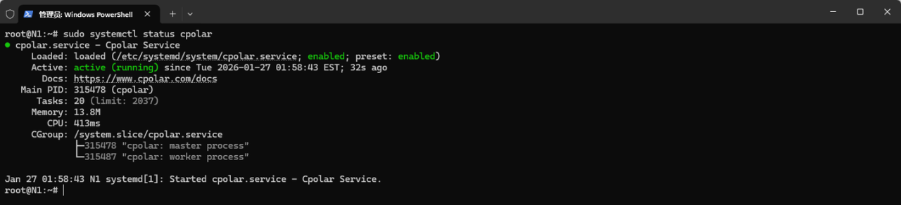 安装完成后,执行下方命令查看cpolar服务状态:(如图所示即为正常启动)