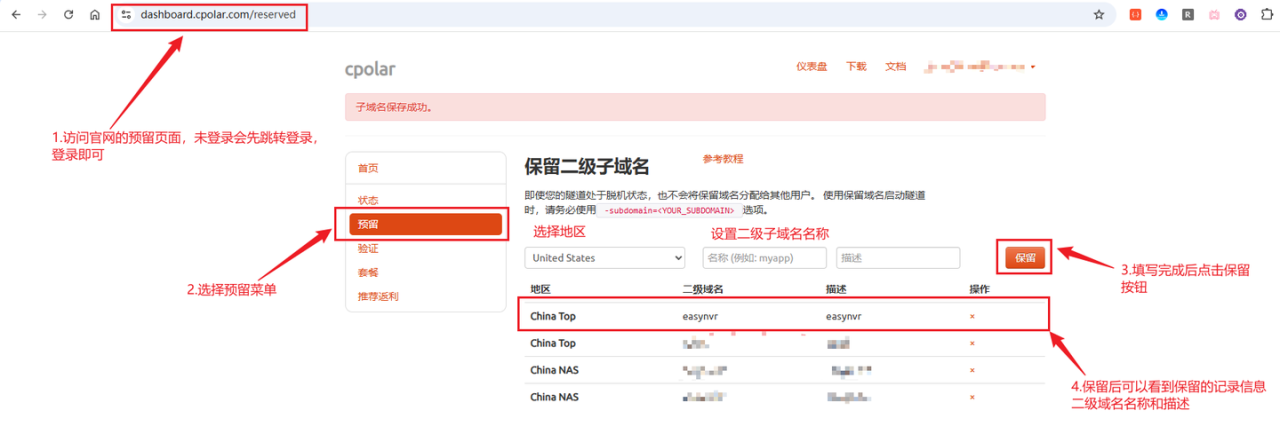 然后,选择预留菜单,即可看到保留二级子域名项,填写其中的地区、名称、描述(可不填)项,然后点击保留按钮,操作步骤图如下: