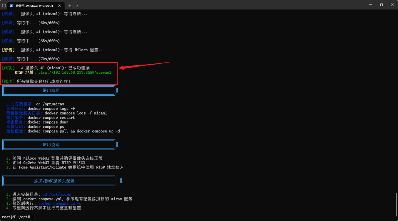 等待镜像拉取成功后,会进行启动,出现如下信息即启动成功,然后访问miloco的webUI界面: