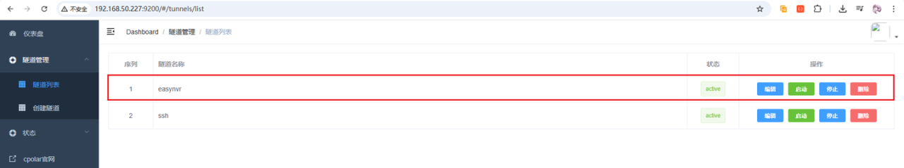 接着,进入侧边菜单栏的隧道管理下的隧道列表,可以看到名为easynvr的隧道: