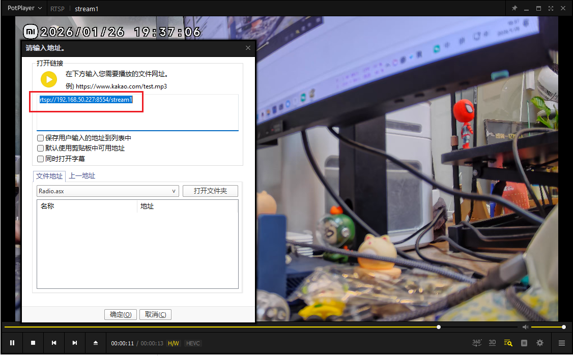 接着,我们使用输出的RTSP地址,在Potplayer、VLC等相关网络播放器中进行播放测试: