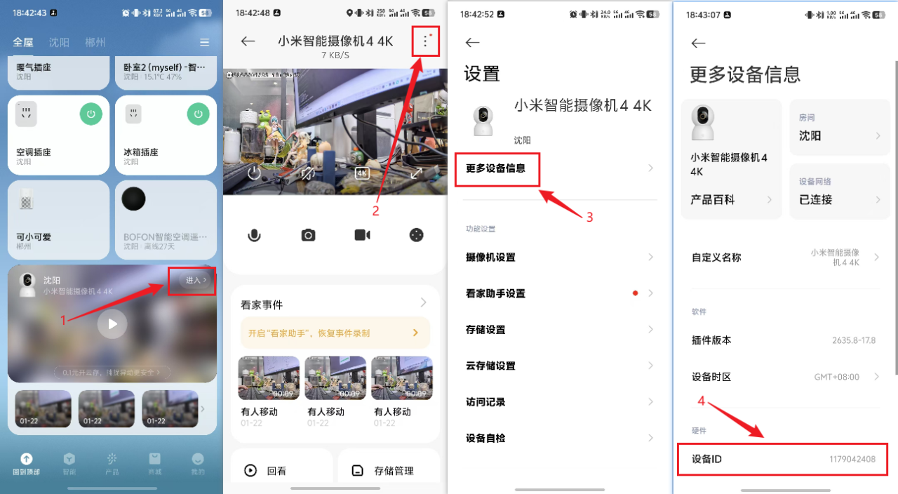 可以看到提示,我们需要输入摄像头的设备ID,以【小米4 4K】 为例,首先打开米家APP,找到你要接入的摄像头设备,点击进入右上角三个点,查看更多设备信息,找到设备IP进行填写,如下图操作: