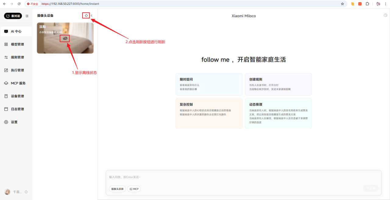 点击跳转后,会在首页AI中心,然后可以看到摄像头设备有一个摄像头,如果显示离线状态,点击上方的刷新按钮进行刷新: