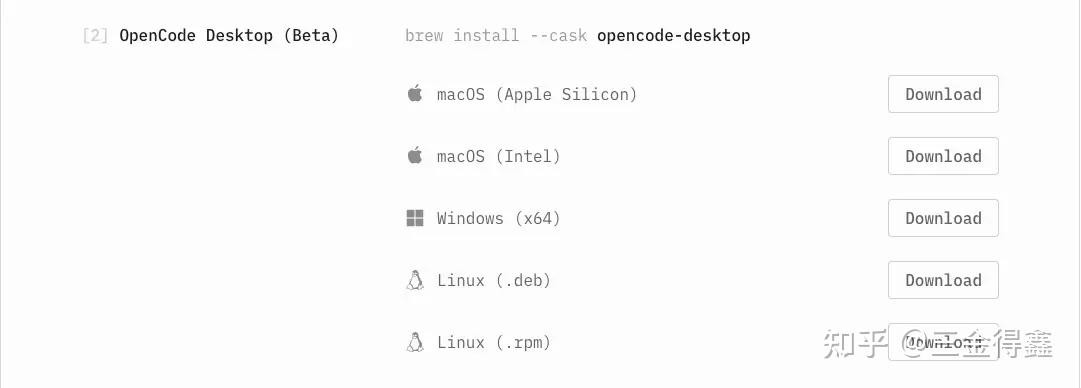 桌面客户端现在还处于 BETA 期,我们可以在 https://opencode.ai/download 页面进行下载: