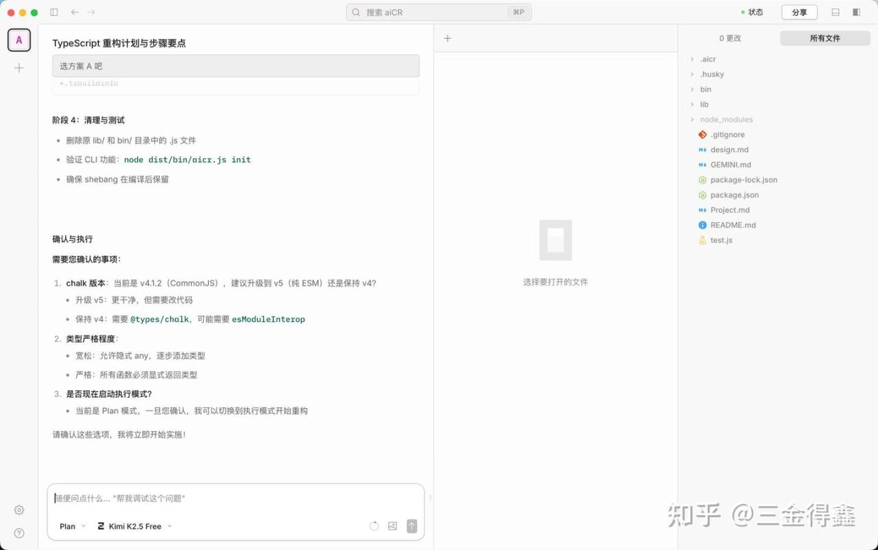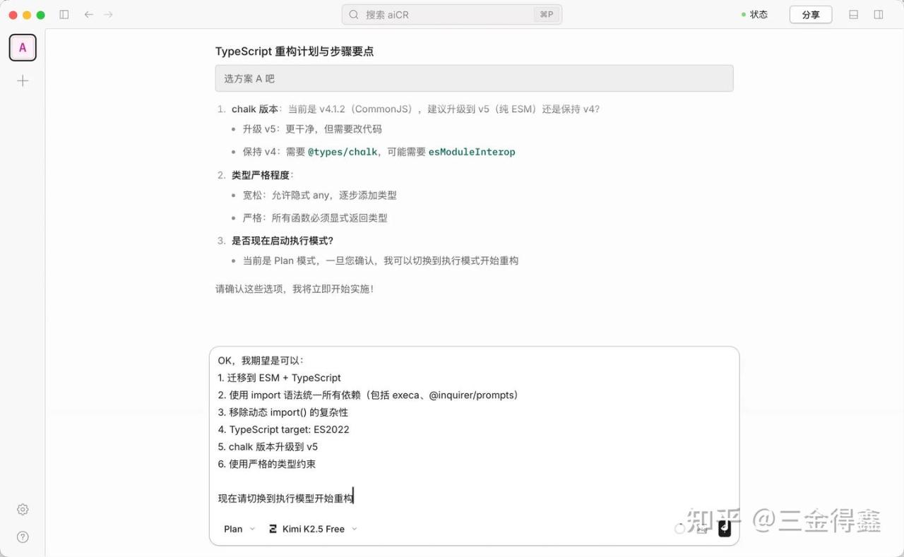 - 在 Plan 模式下,AI 会跟我来回沟通,确认重构方案。比如使用 ESM 还是使用 CommonJS?是升级依赖还是保持原有依赖版本。