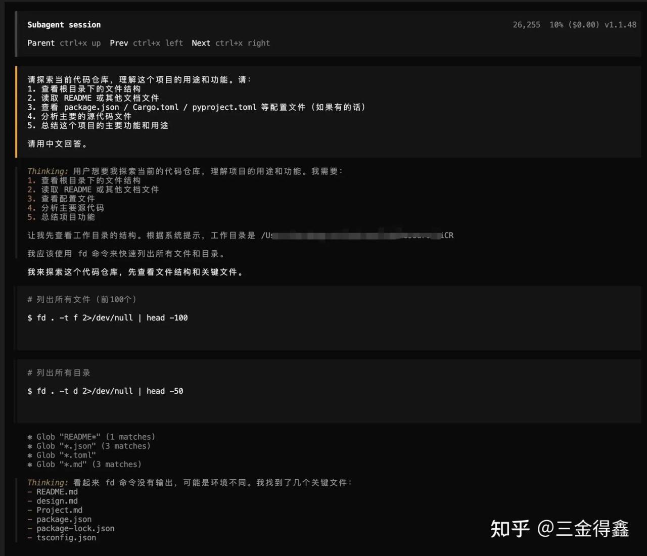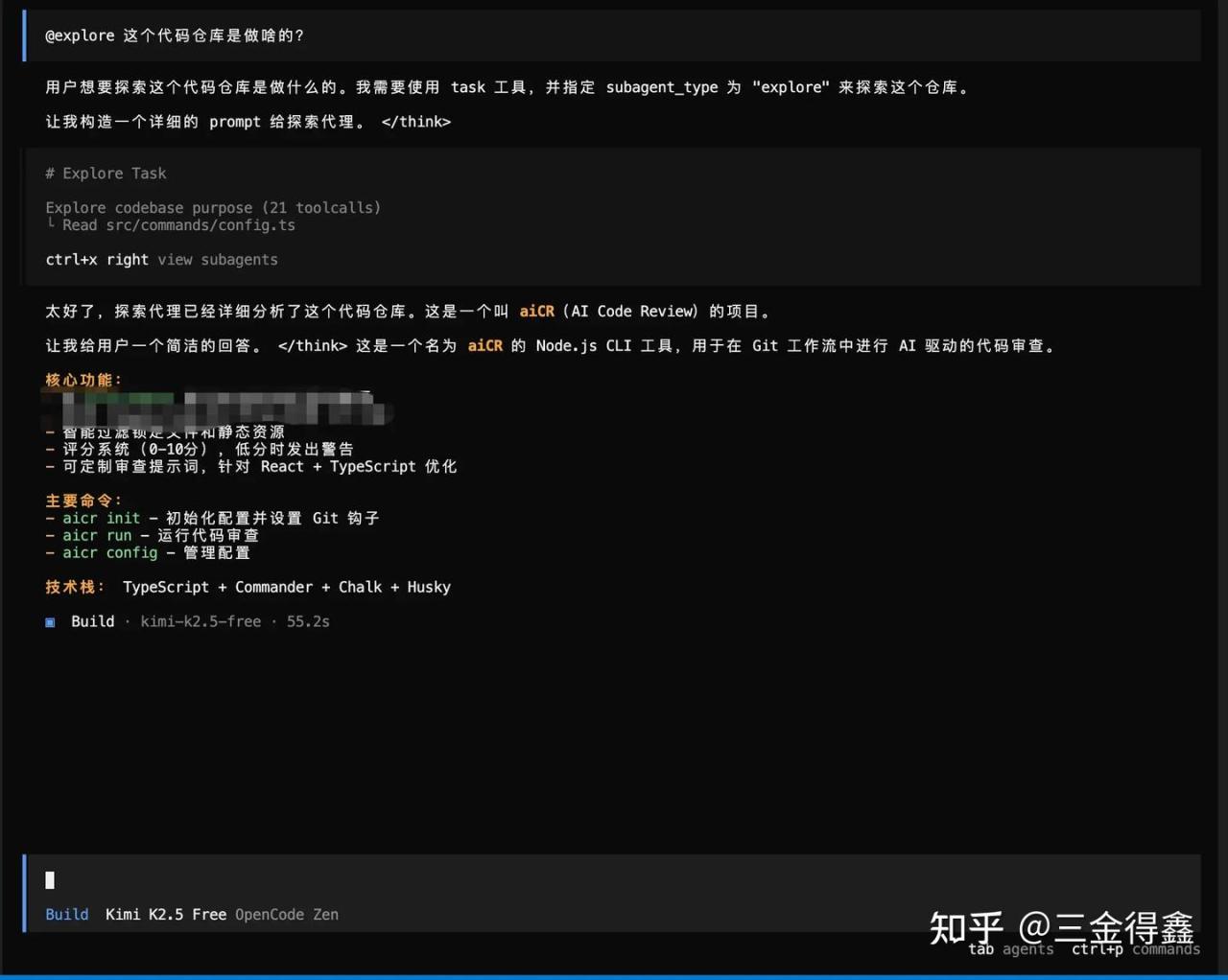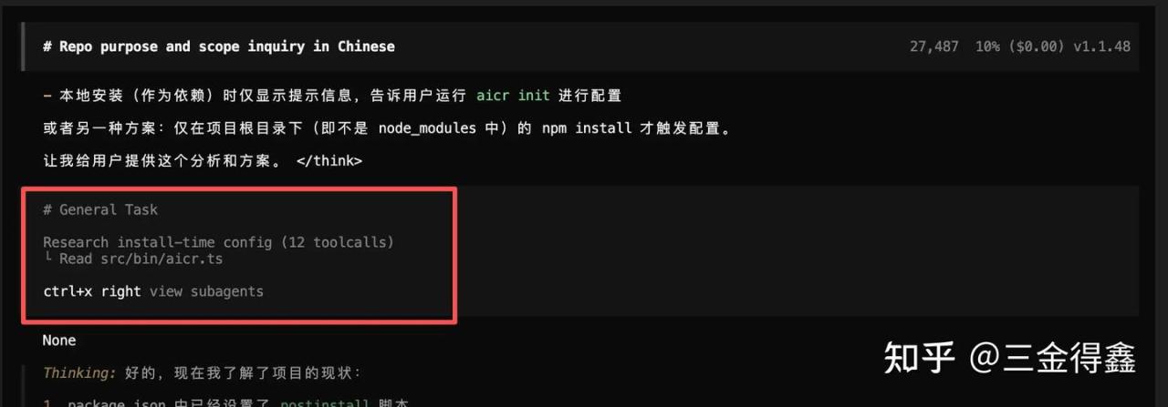 再通过点击上方的 ctrl+x up 回到主会话。需要注意的是,这个子会话的能力三金在 opencode 客户端并没找到,不知道是能力没对齐还是啥,我先提个 issue 先。