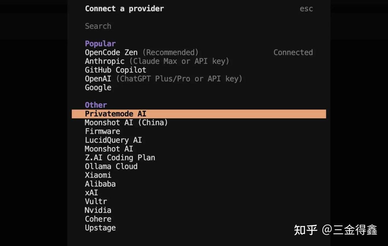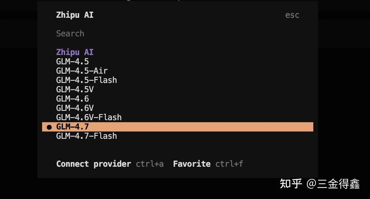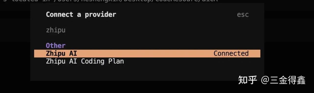 当然,我们也可以配置其他的 AI 模型,之前买了智谱的季卡,让我们一起通过 /connect 来配置一下: