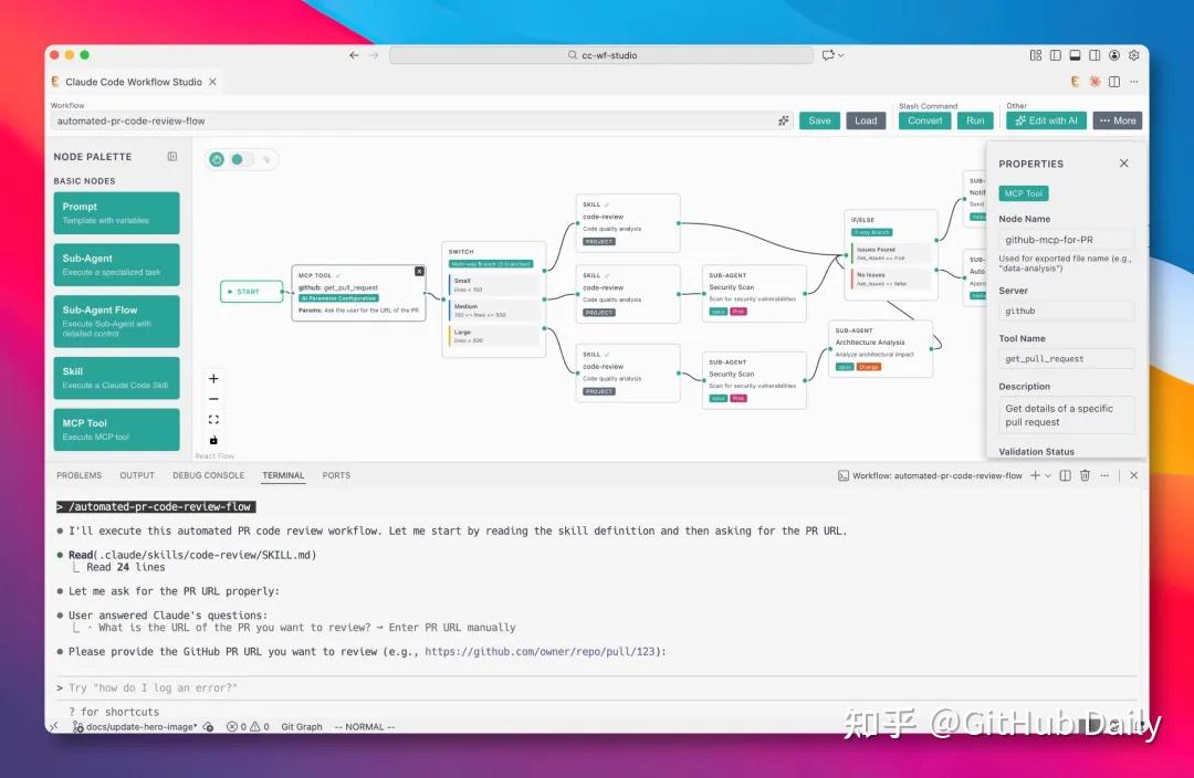 于是在 GitHub 上找到了 CC Workflow Studio 这个 VSCode 插件,它提供了一个强大的可视化编辑器,让我们通过拖拽节点就能轻松设计 AI 工作流。
