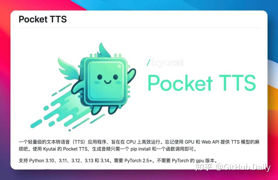 近日,偶然在 GitHub 上发现 Pocket TTS 这个开源项目,它另辟蹊径地专注于 CPU 推理优化,彻底打破了硬件门槛。