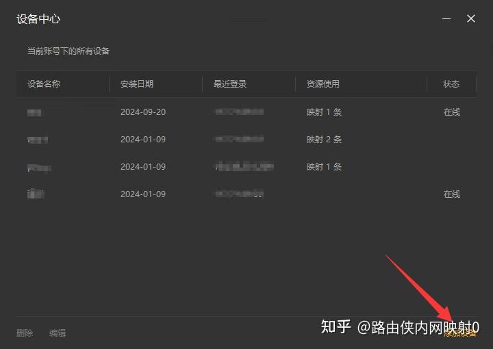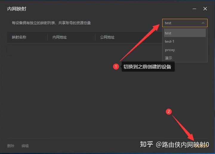 8,注意右上角的设备名称下拉框,这里选中刚刚添加的设备名称,此时在这个界面上添加的映射,就属于刚刚这个设备。添加或修改一般需要等待30秒,容器中的路由侠进程就会更新并加载。切换好设备后,点击【添加映射】。