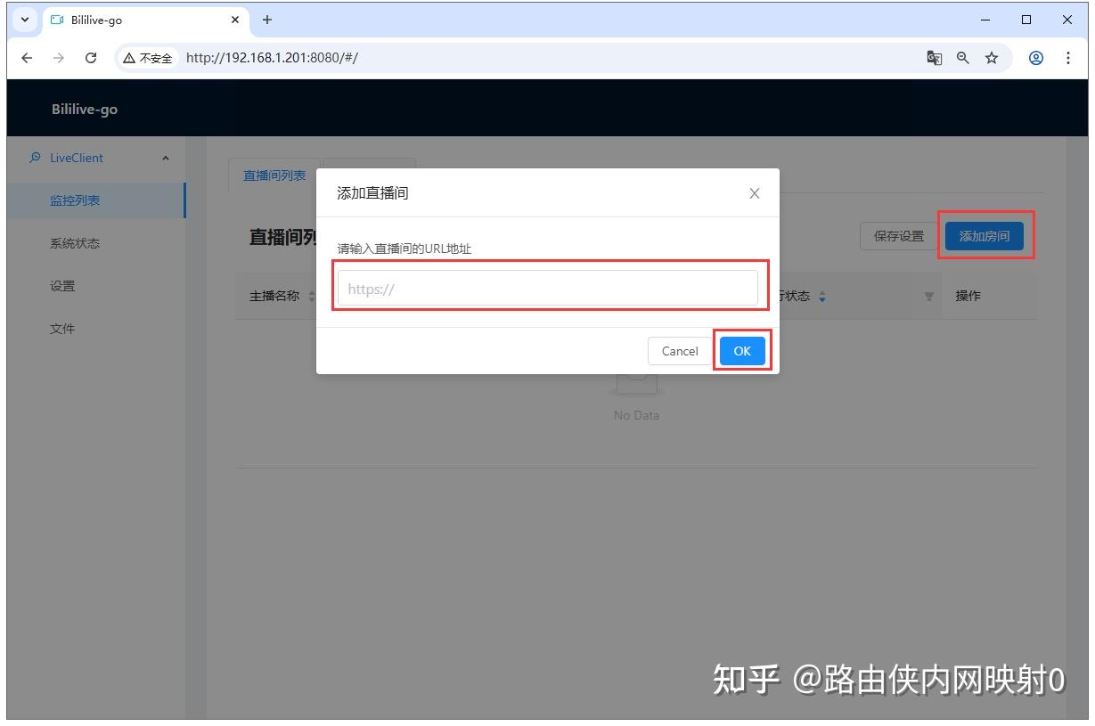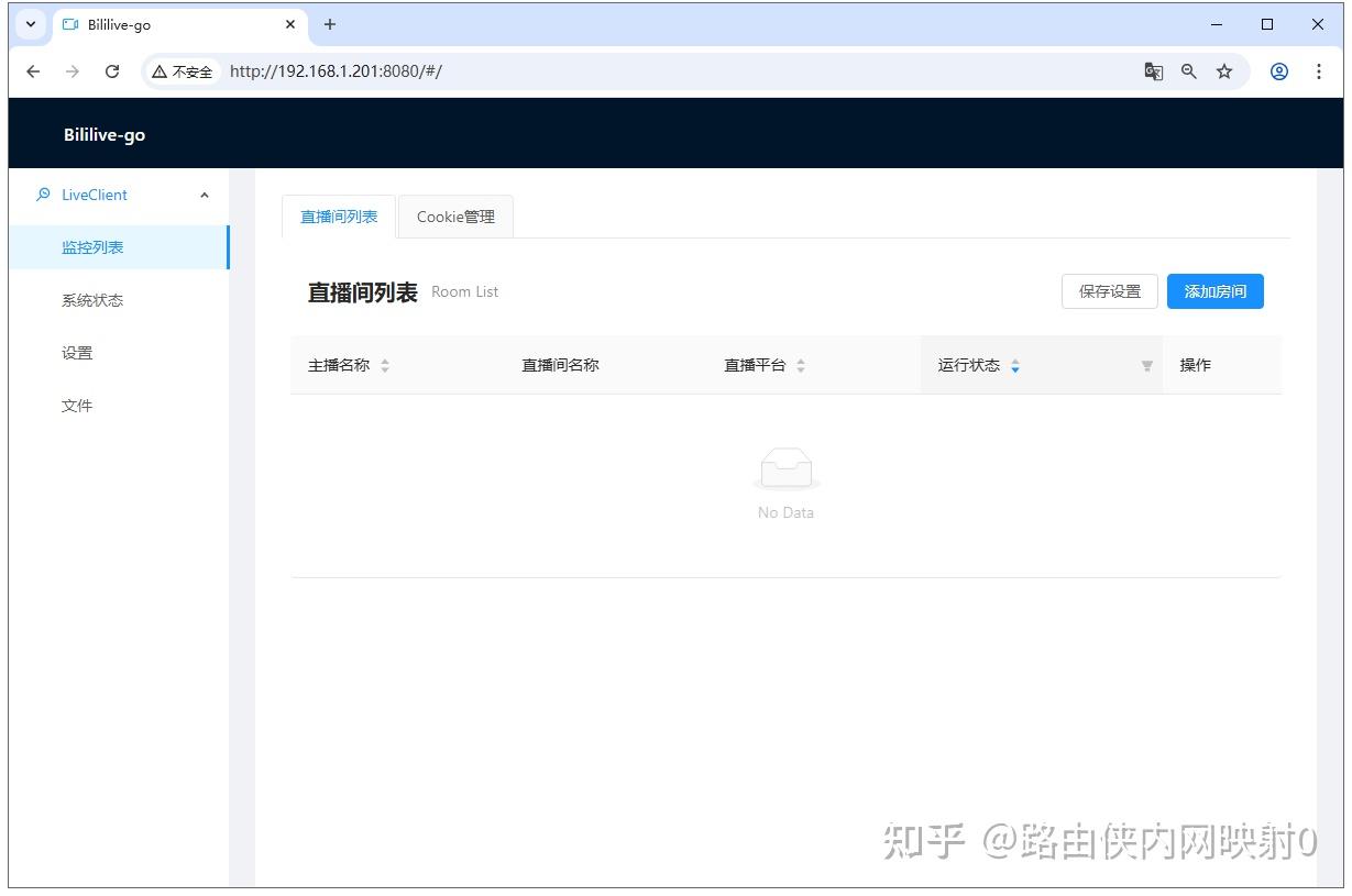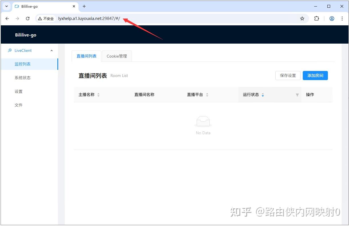 12,在外网电脑上,打开浏览器,在地址栏输入从路由侠生成的外网地址,就可以看到内网部署的 bililive-go 界面了。