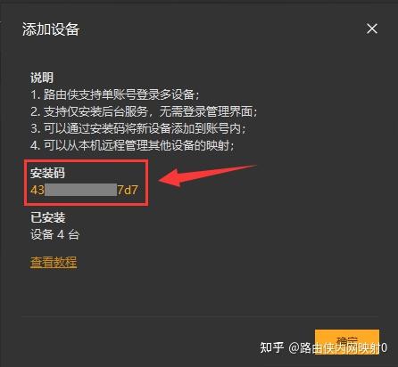 2,在路由侠客户端主界面,进入“设备管理”,点击右下角的“添加设备”,此时可查看到对应的安装码,此安装码用于将设备添加到对应账号下,可选中后复制。
