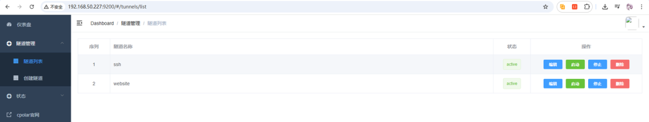 点击左侧菜单栏的隧道管理,展开进入隧道列表页面,页面下默认会有 2 个隧道: