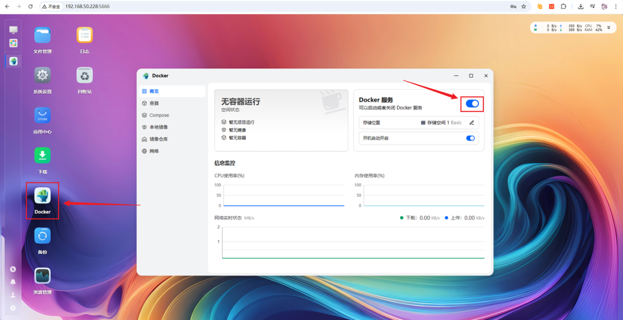 在部署之前,首先确保你的Docker为启动状态,在飞牛Nas首页,点击Docker图标,进入应用内启动Docker服务: